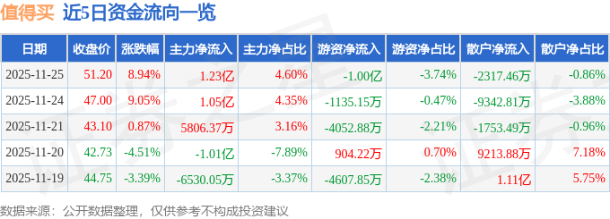 证券之星消息,截至2025年11月25日收盘,值得买(300785)报收于51.2元,上涨8.94%,换手率43.77%,成交量53.55万手,成交额26.8亿元。