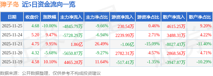 证券之星消息,截至2025年11月25日收盘,獐子岛(002069)报收于4.68元,下跌10.0%,跌停,换手率15.0%,成交量106.52万手,成交额5.02亿元。