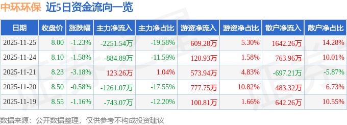 证券之星消息,截至2025年11月25日收盘,中环环保(300692)报收于8.0元,下跌1.23%,换手率3.48%,成交量14.3万手,成交额1.15亿元。