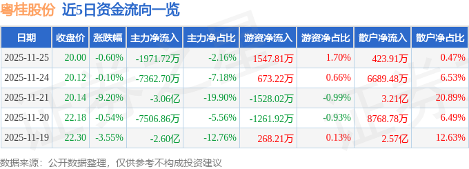 证券之星消息,截至2025年11月25日收盘,粤桂股份(000833)报收于20.0元,下跌0.6%,换手率9.99%,成交量45.34万手,成交额9.11亿元。
