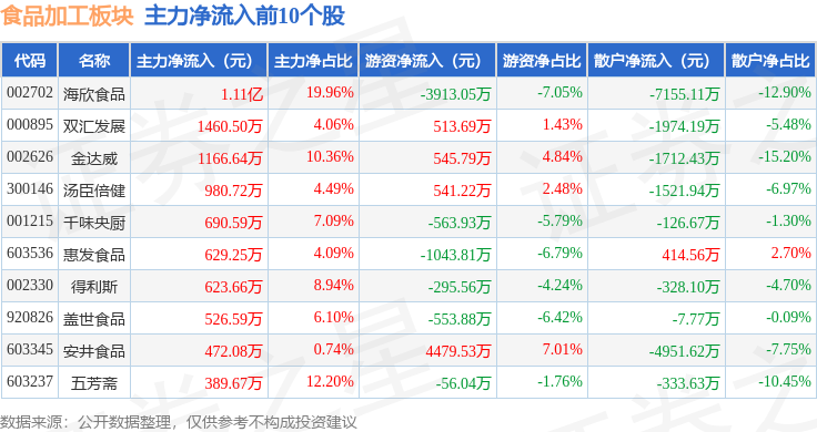 从资金流向上来看,当日食品加工板块主力资金净流入1.6亿元,游资资金净流入2248.1万元,散户资金净流出1.82亿元。食品加工板块个股资金流向见下表: