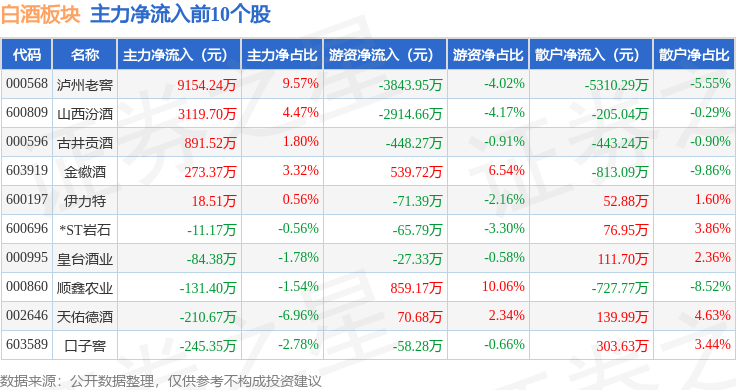 从资金流向上来看,当日白酒板块主力资金净流出3.23亿元,游资资金净流入2.48亿元,散户资金净流入7474.35万元。白酒板块个股资金流向见下表: