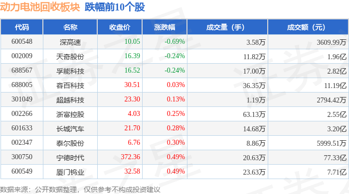 从资金流向上来看,当日动力电池回收板块主力资金净流入3.48亿元,游资资金净流入2.37亿元,散户资金净流出5.85亿元。动力电池回收板块个股资金流向见下表: