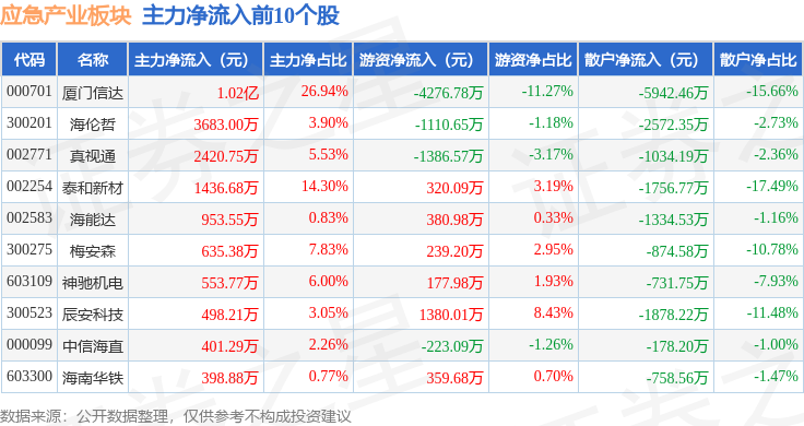 从资金流向上来看,当日应急产业板块主力资金净流出2.29亿元,游资资金净流出5409.95万元,散户资金净流入2.83亿元。应急产业板块个股资金流向见下表: