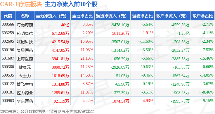 从资金流向上来看,当日CAR-T疗法板块主力资金净流入3.31亿元,游资资金净流出1.54亿元,散户资金净流出1.77亿元。CAR-T疗法板块个股资金流向见下表: