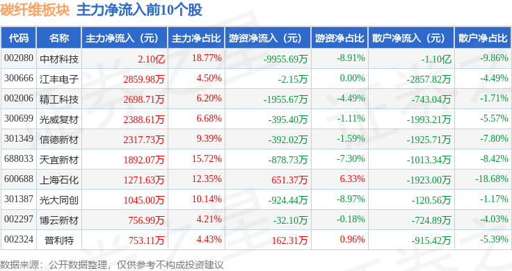 从资金流向上来看,当日碳纤维板块主力资金净流出1.14亿元,游资资金净流入1103.9万元,散户资金净流入1.03亿元。碳纤维板块个股资金流向见下表: