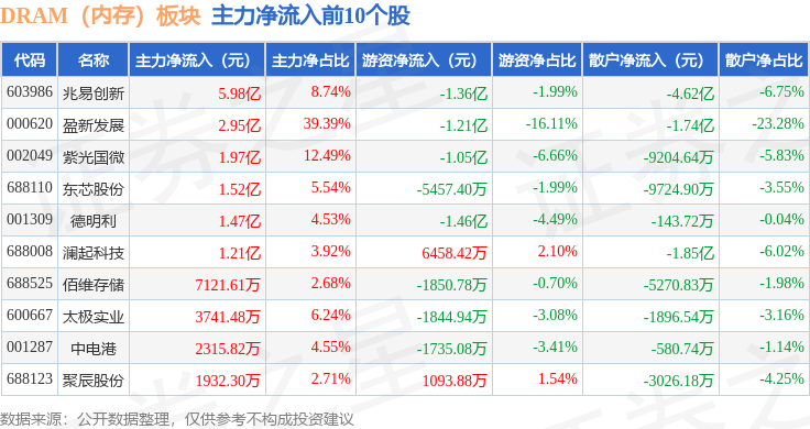从资金流向上来看,当日DRAM(内存)板块主力资金净流入11.75亿元,游资资金净流出3.5亿元,散户资金净流出8.25亿元。DRAM(内存)板块个股资金流向见下表: