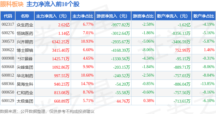 从资金流向上来看,当日眼科板块主力资金净流入3.75亿元,游资资金净流出1.23亿元,散户资金净流出2.52亿元。眼科板块个股资金流向见下表: