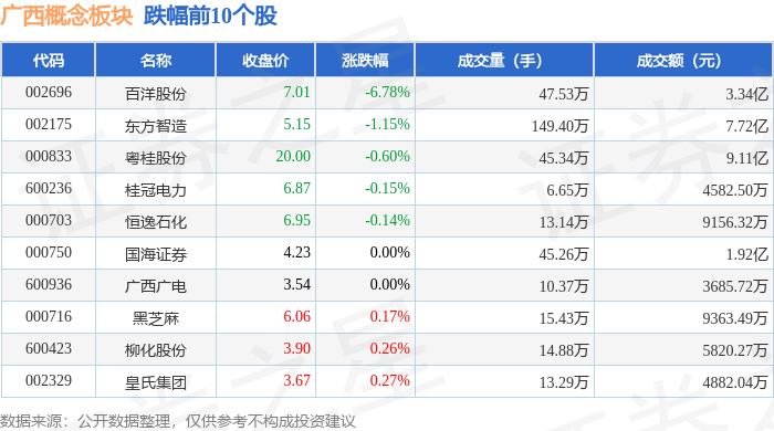 从资金流向上来看,当日广西概念板块主力资金净流入4.76亿元,游资资金净流出1.58亿元,散户资金净流出3.17亿元。广西概念板块个股资金流向见下表: