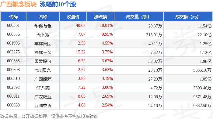 证券之星消息,11月25日广西概念板块较上一交易日上涨1.46%,华锡有色领涨。当日上证指数报收于3870.02,上涨0.87%。深证成指报收于12777.31,上涨1.53%。广西概念板块个股涨跌见下表: