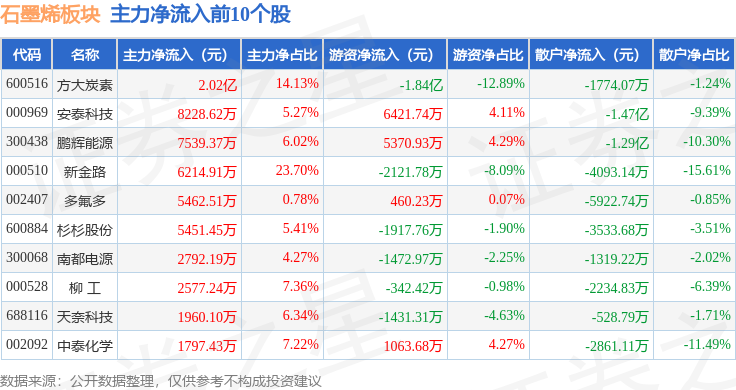从资金流向上来看,当日石墨烯板块主力资金净流出2.09亿元,游资资金净流入1.18亿元,散户资金净流入9095.74万元。石墨烯板块个股资金流向见下表: