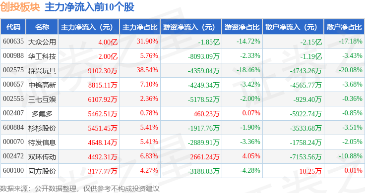 从资金流向上来看,当日创投板块主力资金净流出9.23亿元,游资资金净流入3.24亿元,散户资金净流入6.0亿元。创投板块个股资金流向见下表: