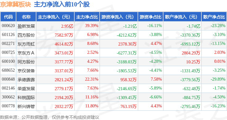 从资金流向上来看,当日京津冀板块主力资金净流出12.77亿元,游资资金净流入1.55亿元,散户资金净流入11.22亿元。京津冀板块个股资金流向见下表:
