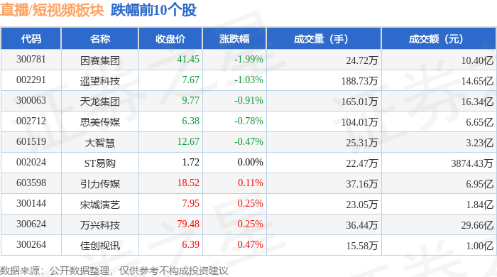 从资金流向上来看,当日直播/短视频板块主力资金净流出15.89亿元,游资资金净流入5.17亿元,散户资金净流入10.72亿元。直播/短视频板块个股资金流向见下表: