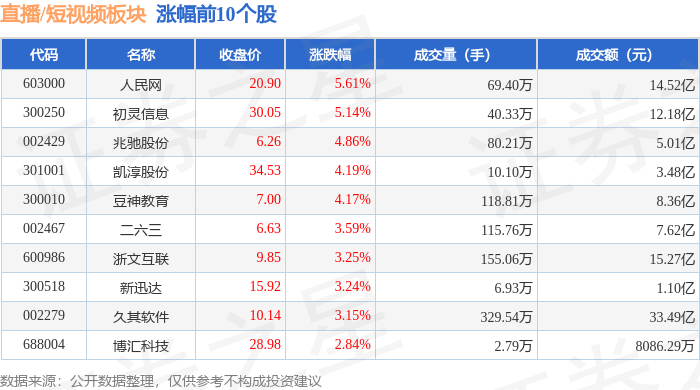 证券之星消息,11月25日直播/短视频板块较上一交易日上涨1.77%,人民网领涨。当日上证指数报收于3870.02,上涨0.87%。深证成指报收于12777.31,上涨1.53%。直播/短视频板块个股涨跌见下表: