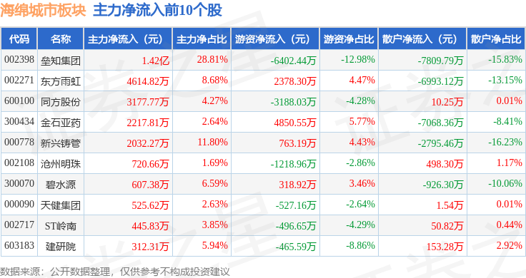 从资金流向上来看,当日海绵城市板块主力资金净流入2.09亿元,游资资金净流出3859.31万元,散户资金净流出1.71亿元。海绵城市板块个股资金流向见下表: