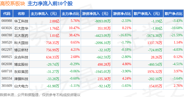 从资金流向上来看,当日高校系板块主力资金净流入2.75亿元,游资资金净流出7547.36万元,散户资金净流出2.0亿元。高校系板块个股资金流向见下表: