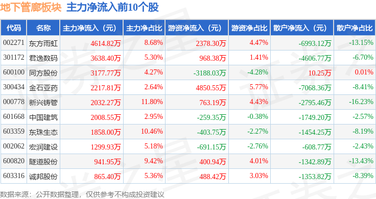 从资金流向上来看,当日地下管廊板块主力资金净流入8532.52万元,游资资金净流入9536.86万元,散户资金净流出1.81亿元。地下管廊板块个股资金流向见下表: