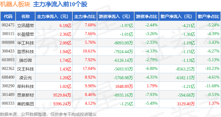 从资金流向上来看,当日机器人板块主力资金净流入1.21亿元,游资资金净流出5.08亿元,散户资金净流入3.87亿元。机器人板块个股资金流向见下表: