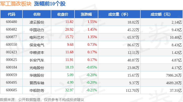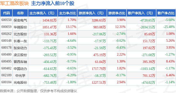 从资金流向上来看,当日军工混改板块主力资金净流出12.09亿元,游资资金净流入4.93亿元,散户资金净流入7.16亿元。军工混改板块个股资金流向见下表: