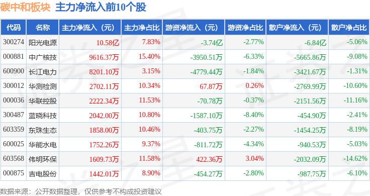 从资金流向上来看,当日碳中和板块主力资金净流入4.12亿元,游资资金净流出8117.94万元,散户资金净流出3.31亿元。碳中和板块个股资金流向见下表: