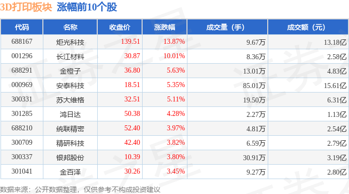 从资金流向上来看,当日3D打印板块主力资金净流入9855.77万元,游资资金净流入1.34亿元,散户资金净流出2.32亿元。3D打印板块个股资金流向见下表: