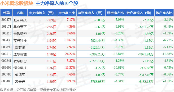 从资金流向上来看,当日小米概念股板块主力资金净流入25.57亿元,游资资金净流出13.89亿元,散户资金净流出11.67亿元。小米概念股板块个股资金流向见下表: