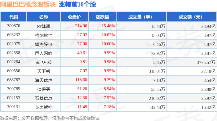 从资金流向上来看,当日阿里巴巴概念股板块主力资金净流出14.8亿元,游资资金净流出5.88亿元,散户资金净流入20.68亿元。阿里巴巴概念股板块个股资金流向见下表: