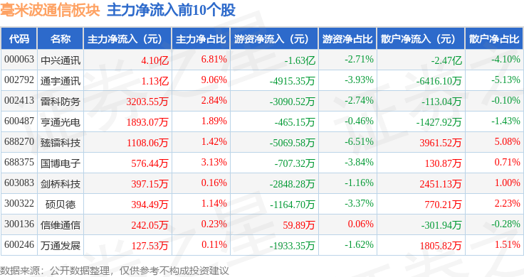 从资金流向上来看,当日毫米波通信板块主力资金净流入2.34亿元,游资资金净流出2.89亿元,散户资金净流入5442.08万元。毫米波通信板块个股资金流向见下表: