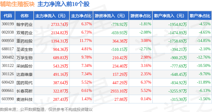 从资金流向上来看,当日辅助生殖板块主力资金净流出8926.28万元,游资资金净流入7365.82万元,散户资金净流入1560.46万元。辅助生殖板块个股资金流向见下表: