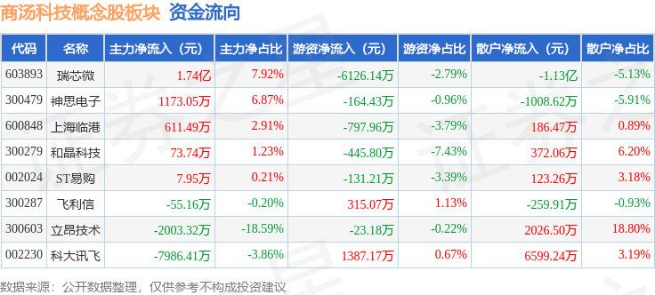 从资金流向上来看,当日商汤科技概念股板块主力资金净流入9206.29万元,游资资金净流出5986.5万元,散户资金净流出3219.79万元。商汤科技概念股板块个股资金流向见下表: