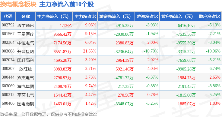 从资金流向上来看,当日换电概念板块主力资金净流入1.16亿元,游资资金净流入655.08万元,散户资金净流出1.23亿元。换电概念板块个股资金流向见下表: