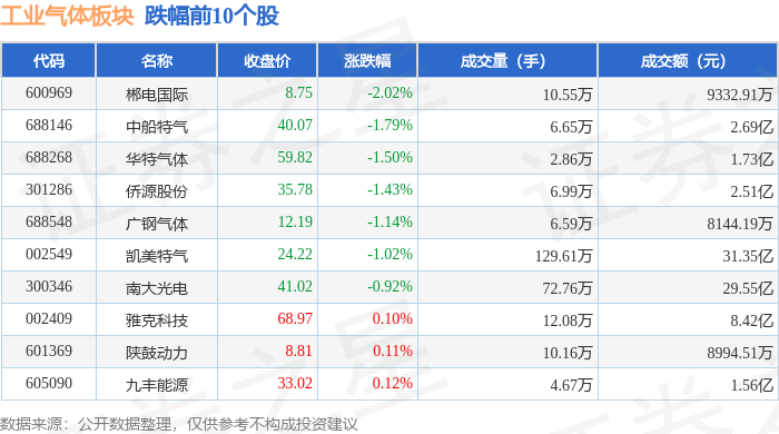 从资金流向上来看,当日工业气体板块主力资金净流出3.62亿元,游资资金净流入1.96亿元,散户资金净流入1.66亿元。工业气体板块个股资金流向见下表: