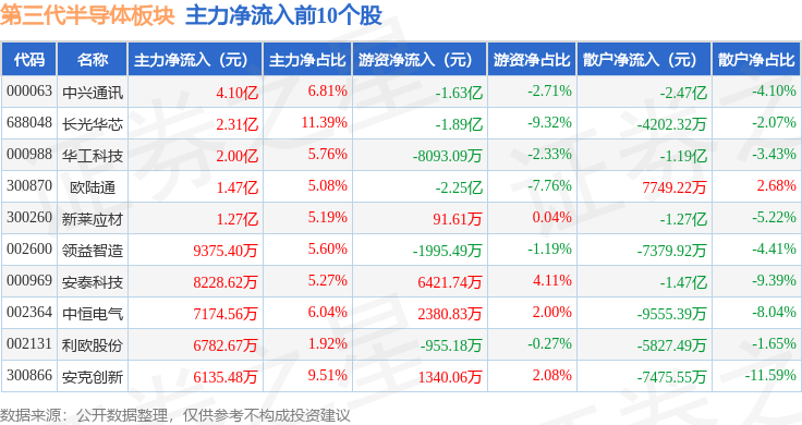 从资金流向上来看,当日第三代半导体板块主力资金净流入1.57亿元,游资资金净流出1.12亿元,散户资金净流出4529.89万元。第三代半导体板块个股资金流向见下表: