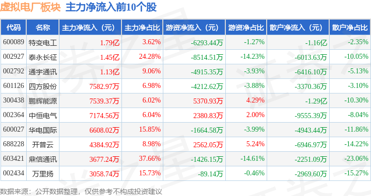 从资金流向上来看,当日虚拟电厂板块主力资金净流入5.74亿元,游资资金净流出1.22亿元,散户资金净流出4.52亿元。虚拟电厂板块个股资金流向见下表: