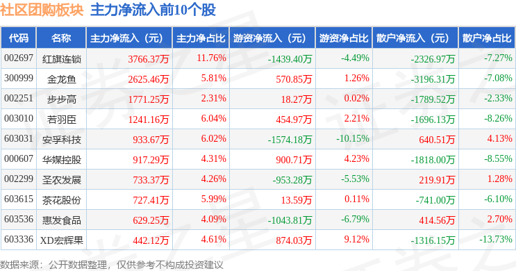 从资金流向上来看,当日社区团购板块主力资金净流出2.6亿元,游资资金净流入5902.76万元,散户资金净流入2.01亿元。社区团购板块个股资金流向见下表: