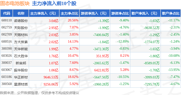 从资金流向上来看,当日固态电池板块主力资金净流入23.85亿元,游资资金净流出2.46亿元,散户资金净流出21.39亿元。固态电池板块个股资金流向见下表: