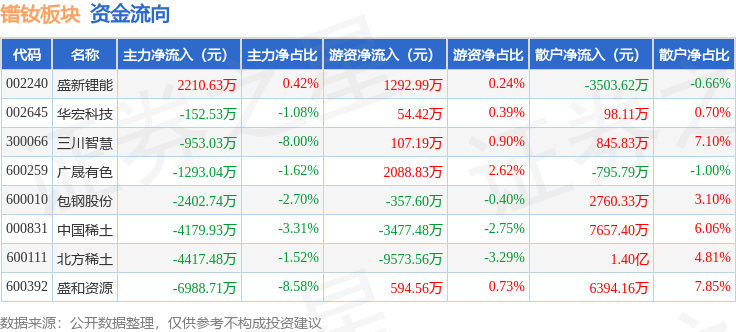 从资金流向上来看,当日镨钕板块主力资金净流出1.82亿元,游资资金净流出9270.65万元,散户资金净流入2.74亿元。镨钕板块个股资金流向见下表: