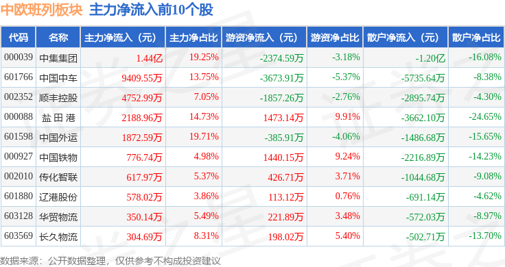 从资金流向上来看,当日中欧班列板块主力资金净流入2.9亿元,游资资金净流出1957.39万元,散户资金净流出2.7亿元。中欧班列板块个股资金流向见下表: