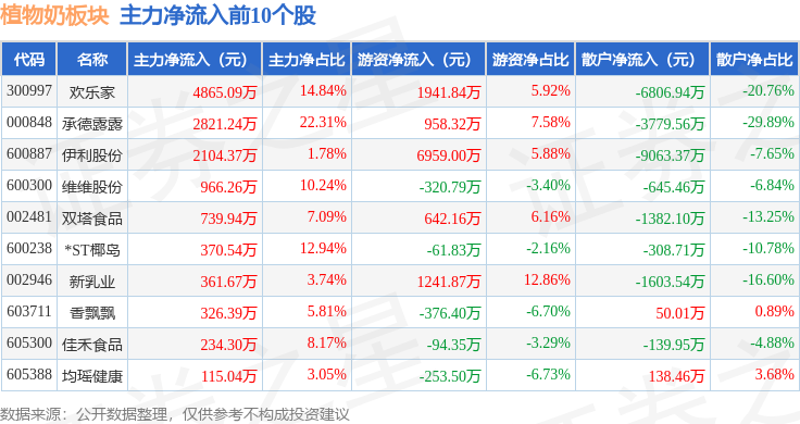 从资金流向上来看,当日植物奶板块主力资金净流入8352.81万元,游资资金净流入9127.63万元,散户资金净流出1.75亿元。植物奶板块个股资金流向见下表: