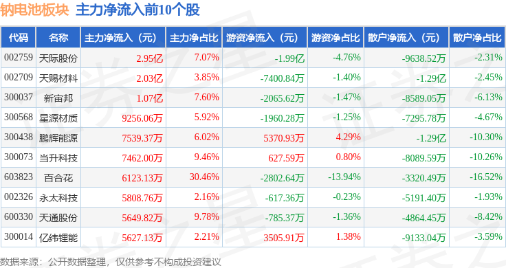 从资金流向上来看,当日钠电池板块主力资金净流入14.64亿元,游资资金净流出1.13亿元,散户资金净流出13.51亿元。钠电池板块个股资金流向见下表: