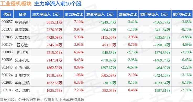 从资金流向上来看,当日工业母机板块主力资金净流入3665.74万元,游资资金净流入1.81亿元,散户资金净流出2.18亿元。工业母机板块个股资金流向见下表: