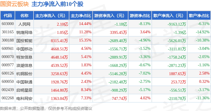 从资金流向上来看,当日国资云板块主力资金净流出12.33亿元,游资资金净流入3.1亿元,散户资金净流入9.23亿元。国资云板块个股资金流向见下表: