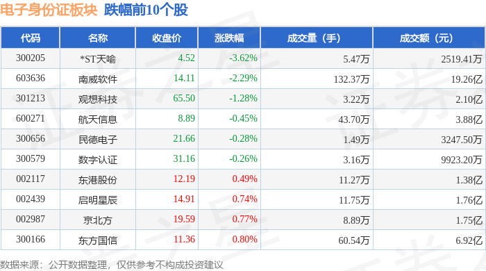 从资金流向上来看,当日电子身份证板块主力资金净流出1.52亿元,游资资金净流出8902.15万元,散户资金净流入2.41亿元。电子身份证板块个股资金流向见下表: