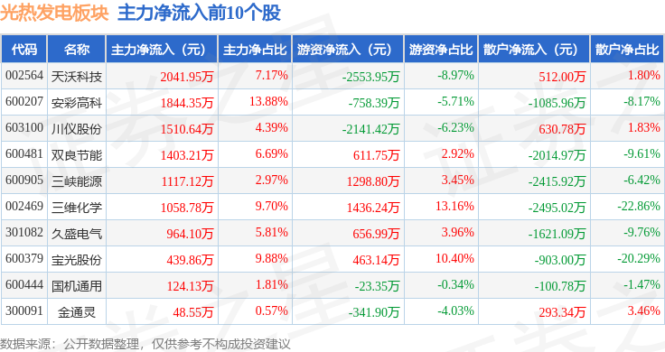 从资金流向上来看,当日光热发电板块主力资金净流出1.93亿元,游资资金净流入3970.27万元,散户资金净流入1.54亿元。光热发电板块个股资金流向见下表: