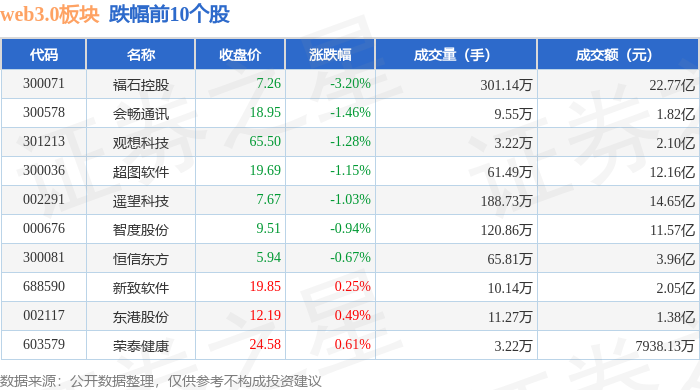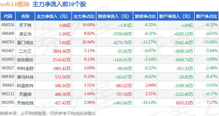 从资金流向上来看,当日web3.0板块主力资金净流出14.55亿元,游资资金净流入4.09亿元,散户资金净流入10.45亿元。web3.0板块个股资金流向见下表: