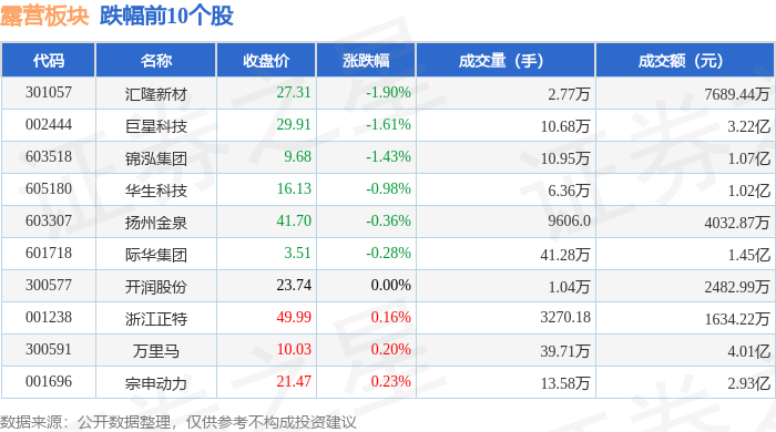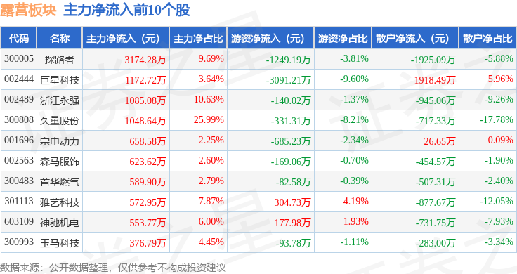 从资金流向上来看,当日露营板块主力资金净流出3707.66万元,游资资金净流出6318.54万元,散户资金净流入1.0亿元。露营板块个股资金流向见下表: