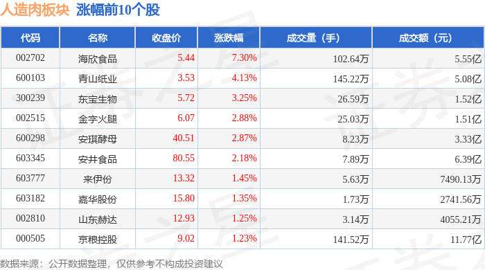 证券之星消息,11月25日人造肉板块较上一交易日上涨0.85%,海欣食品领涨。当日上证指数报收于3870.02,上涨0.87%。深证成指报收于12777.31,上涨1.53%。人造肉板块个股涨跌见下表: