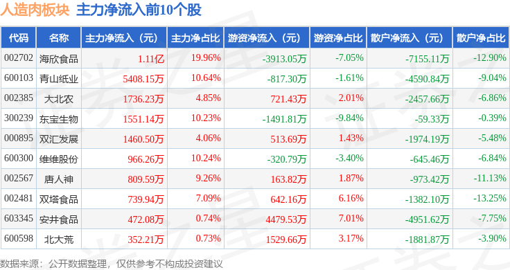 从资金流向上来看,当日人造肉板块主力资金净流入8576.47万元,游资资金净流入9005.49万元,散户资金净流出1.76亿元。人造肉板块个股资金流向见下表: