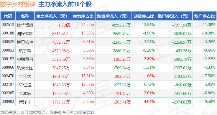 从资金流向上来看,当日数字乡村板块主力资金净流出7.63亿元,游资资金净流入5269.72万元,散户资金净流入7.11亿元。数字乡村板块个股资金流向见下表: